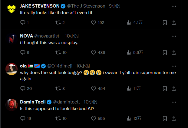 昨晚DC官推发布了DCU新电影《超人:传承》首张剧照,但立刻引来了不少玩家的质疑和不满,有粉丝认为这套服装有点“草率”且并不合身,并且部分细节处有AI作画的嫌疑。