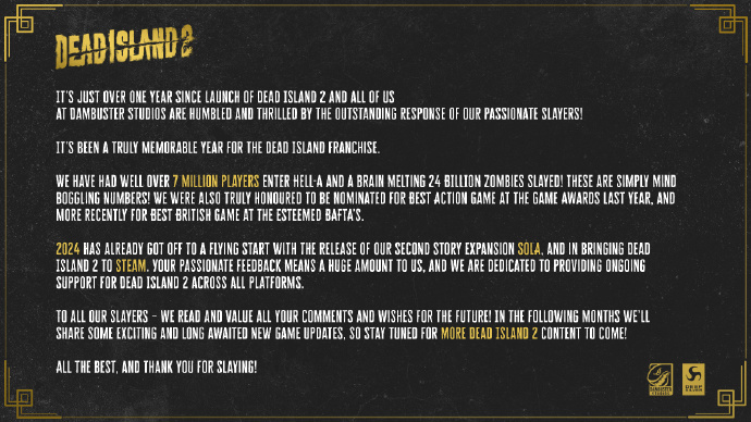 开发商 Dambuster Studios宣布,《死亡岛2》玩家数已超过700万,另外玩家已在游戏中击杀 240亿 只僵尸,并称会在接下来的几个月里分享一些令人兴奋和期待已久的新游戏更新。