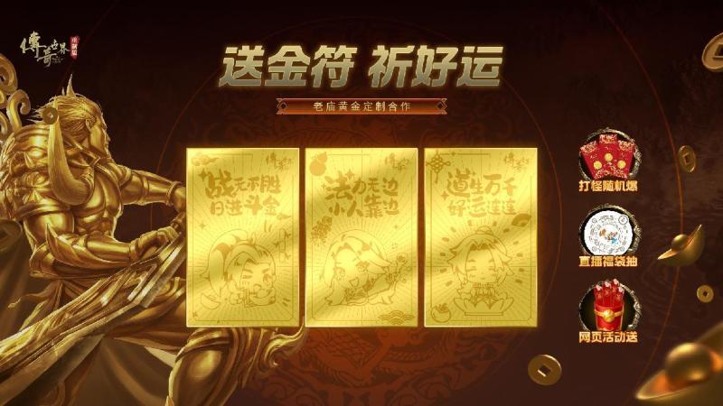 双庙联动中另一大亮点就是老庙黄金的跨界联动。《传奇世界重制版》联手百年老字号重磅定制"传世金符",经由关帝祖庙大师亲自开光后更显价值,11月27日公测后,玩家野外打怪即有机会随机爆出999足金开光"传世好运金符"。此外,在官方直播间不定期会通过福袋送出"武财神金符";专题页活动也开放了抽取通道,让每一位玩家都有机会将这份开服好运收入囊中。