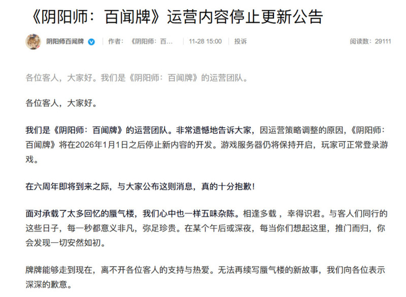 网易《阴阳师:百闻牌》官微今天下午通过官微宣布,因运营策略调整,《阴阳师:百闻牌》将在 2026 年 1 月 1 日之后停止新内容的开发。游戏服务器仍将保持开启,玩家可正常登录游戏。