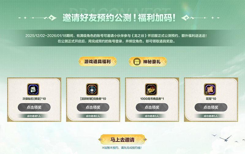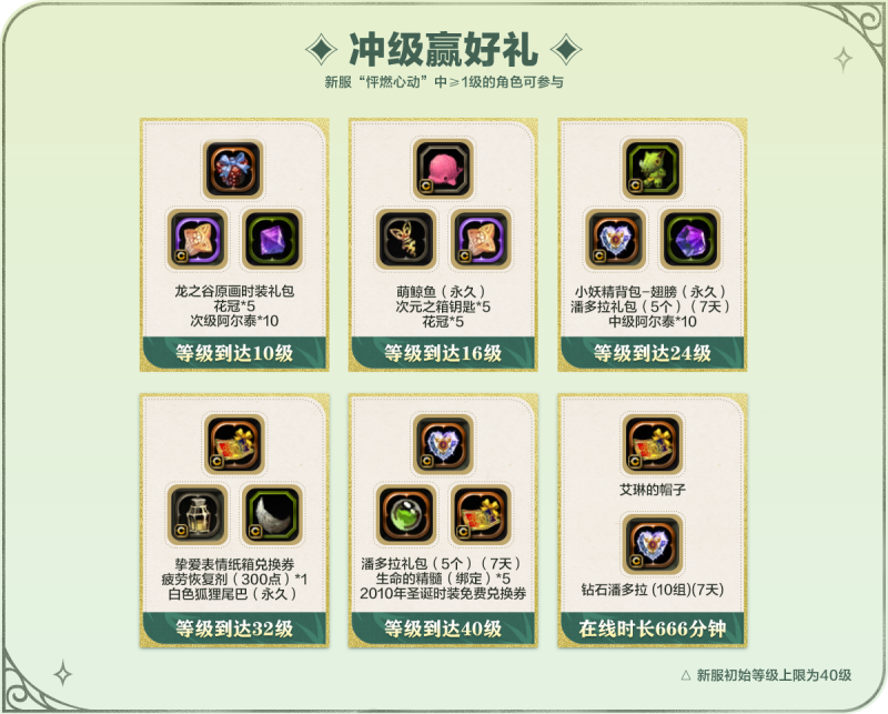 想要轻松升级?想要免费时装、免费头饰、免费潘多拉和各种各样的成长材料,躺着就把福利给领齐?或者,热爱冒险的你,想要再一次体验备战海龙巢穴的热血激昂、铸就新一代的屠龙传奇?2026年1月6日,来《龙之谷》怀旧服“怦燃心动”新服,冲级就能赢好礼。新服开服时,等级上限40级。升级到指定等级,就送原画时装、花冠、萌鲸鱼、小妖精背包、挚爱表情纸箱兑换券、白色狐狸尾巴、圣诞时装免费兑换券、钻石潘多拉礼包等等奖励!完成强化、通关巢穴等任务,还有海量龙币送!每周一至周日,活动时段升级经验+100%。每周末高峰时间,还有掉率+50%增益,全员可享哦!