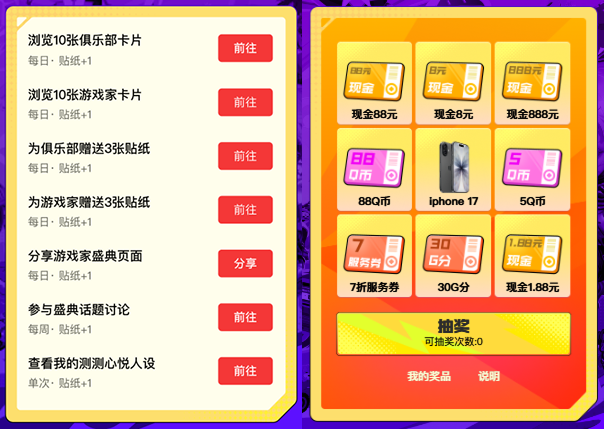 在盛典任务里前往测测你的心悦人设,验证你今年的欧气“属性”并获取幸运号码,听说还有「天选之人」幸运号码虚位以待,就等你来入席解锁iPhone17大奖啦~另外在盛典期间,每周还会从已生成的幸运号码中抽取一位用户获得任天堂Switch奖励~