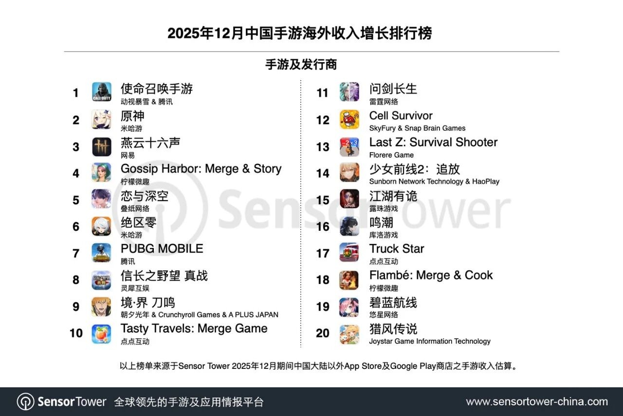 DoNews1月7日消息,Sensor Tower商店情报平台最新数据显示,2025年12月中国手游产品在海外市场收入及下载量排行榜,详细榜单变化如下。