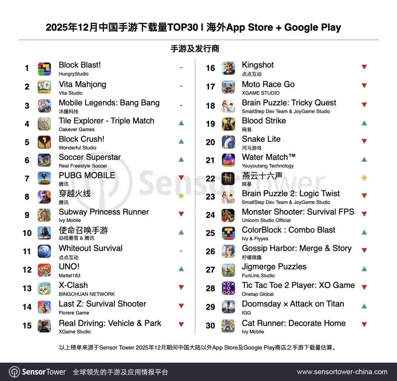 Hungry Studio消除手游《Block Blast!》12月下载量环比上涨11%,再创历史新高,稳居本月出海手游下载榜冠军。