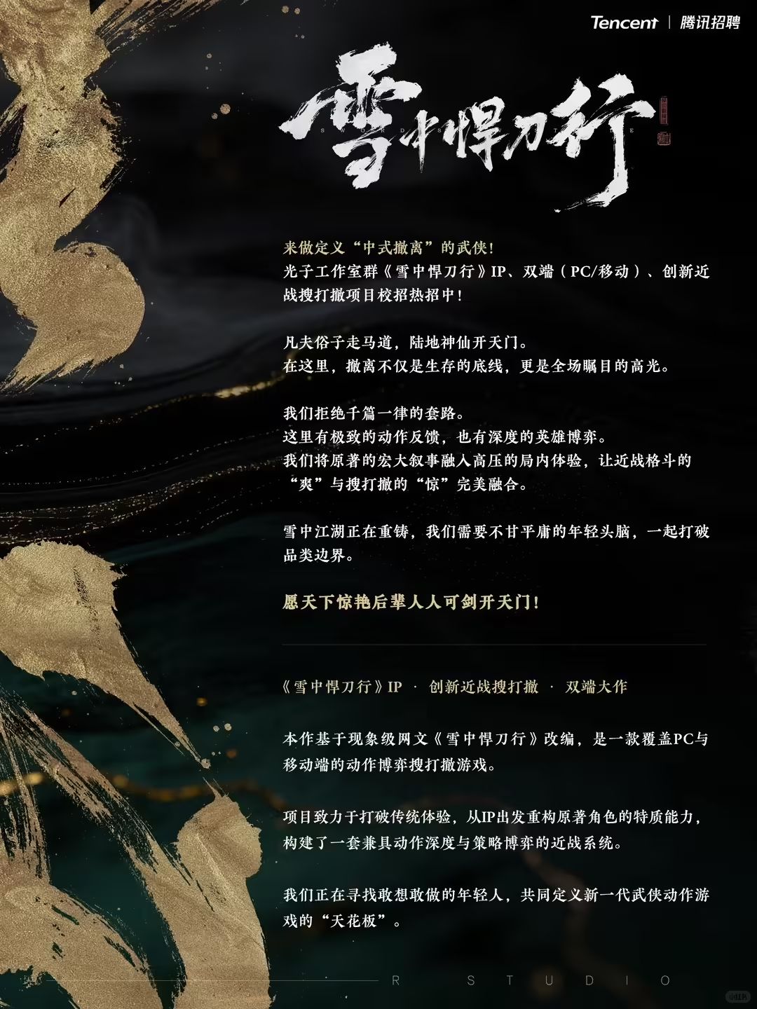 其中,《雪中悍刀行》为 3A 武侠动作夺金撤离游戏,已获双端版号。基于现象级网文《雪中悍刀行》改编,覆盖 PC 与移动端,官方称“项目致力于打破传统体验,从 IP 出发重构原著角色的特质能力,构建了一套兼具动作深度与策略博弈的近战系统。”