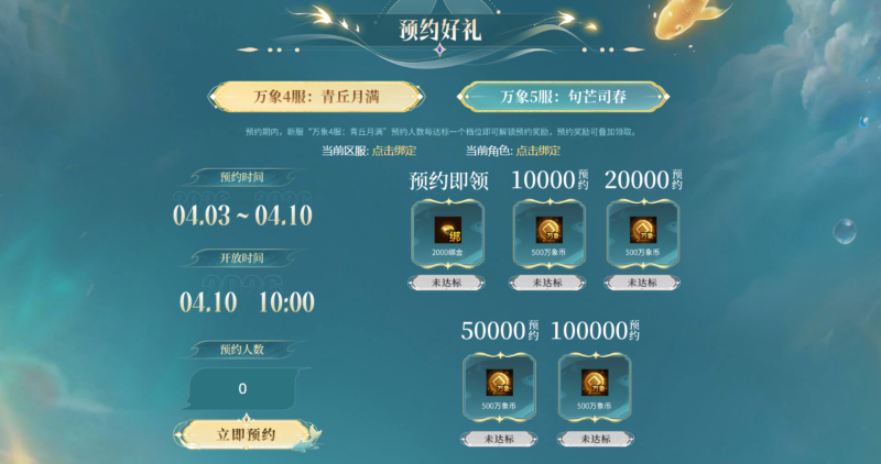 4月10日10:00,万象4服:青丘月满与万象5服:句芒司春正式上线。4月3日至4月10日为预约期,预约期内,新服预约人数每达标一个档位即可解锁预约奖励,预约奖励可叠加领取,最高可领2000万象币!