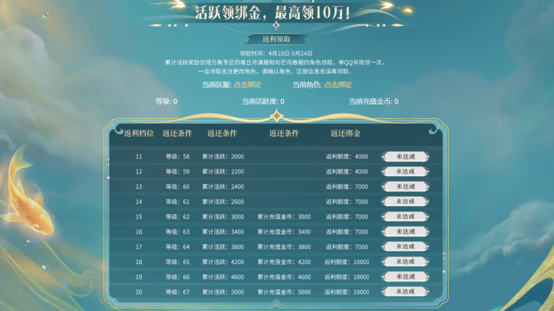 4月10日至5月24日期间,累计活跃到一定数值,可领取相应数量的绑定金,最高可领到10万绑金。需要注意的是,累计活跃奖励仅限万象专区的青丘月满服和句芒司春服的角色领取,且单QQ号限领一次,一旦领取无法更改角色。因此,需玩家确认角色、区服信息无误后,再行领取。