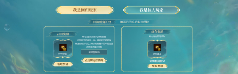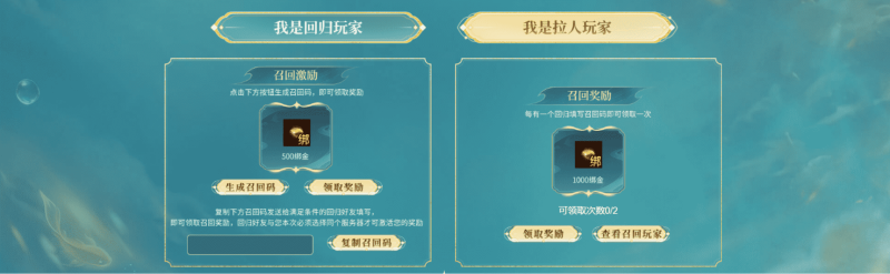 4月10日至5月24日期间,活跃玩家分享召唤码邀请好友回归(每个召唤码仅可使用1次,活跃玩家最多可有2个被使用的召唤码;回归玩家仅可绑定1个召唤码),填写召唤码的好友为回归玩家并与自己同服,且回归好友于万象服开启后绑定角色,拉人回归者即可与回归好友各自获取召回/绑角的绑定金奖励。