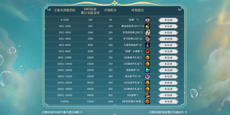 回归玩家为账号≥30天未登录的玩家,回归可根据消耗万象币与累充金币档位,领取回归玩家专属道具奖励。
