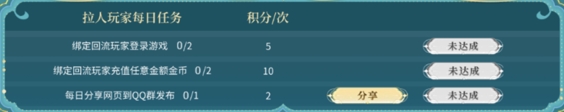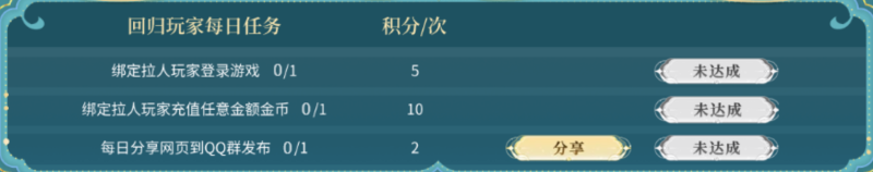 回归玩家与拉人玩家各自完成每日回流任务,可获得积分,对于拉人玩家来说,如召回2名回归玩家,2名回归玩家的万象币消耗数据为相加统计。积分可用来在积分商城换取Q币、万象币、金币等各类货币。