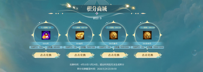 4月10日至5月24日,即回流活动期间,回流积分商城同步开启,完成回流任务,拥有积分的玩家,可根据自己的积分数量去兑换相应的Q币、金币、万象币、圣体币。同时也需天命者注意回流活动时间,超出活动时间(5月24日23:59:59)后再完成任务无法生成积分,也无法进行兑换。