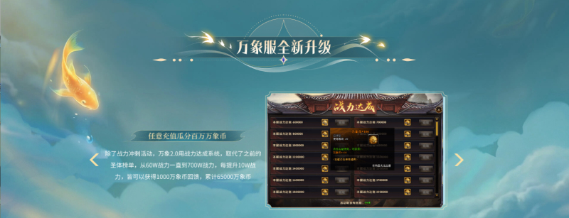新服开启后,天命者进行任意充值后,便可瓜分百万万象币——除了战力冲刺活动,万象2.0用战力达成系统取代了之前的圣体榜单,从60W战力一直到700W战力,每提升10W战力,皆可获得1000万象币回馈,累计65000万象币,助力天命者循环提升!