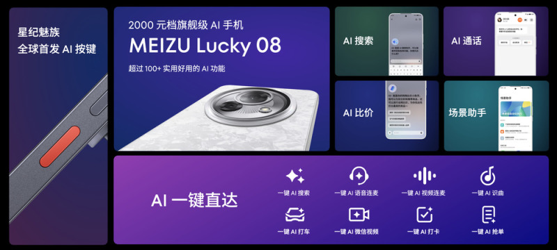 针对广大用户在 AI 功能使用上不够便捷的痛点,星纪魅族为用户专门定制多功能 AI 按键,提供包括一键搜索、一键打车、一键打卡、一键微信视频以及自定义使用场景在内的多种功能,只需一键双击手机,即刻开启智慧 AI 新生活。基于强大的 Flyme AIOS 操作系统,魅族 Lucky 08 搭载 100+ 项旗舰级 AI 技术,其中包括 AI 搜索、即圈即搜、AI 通话、AI 比价、AI 场景助手等众多实用好用的 AI 功能。