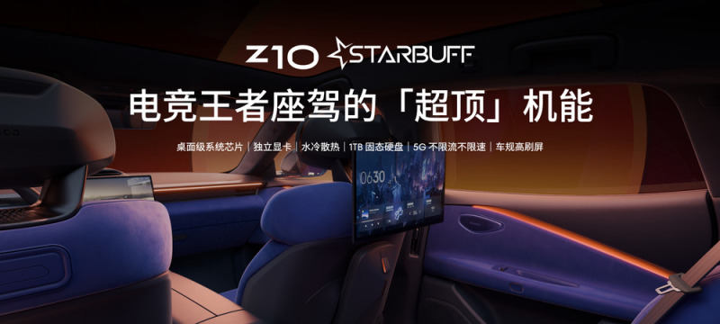Z10 STARBUFF 电竞娱乐座舱拥有媲美 PC 电脑的游戏机能,搭载包括亿咖通·马卡鲁计算平台、AMD V2000A 桌面级芯片、 AMD RX6600M 独立显卡、水冷散热、三星 OLED 车规高刷屏、1TB 固态硬盘以及 5G 高速车载网络在内的众多硬核设备。