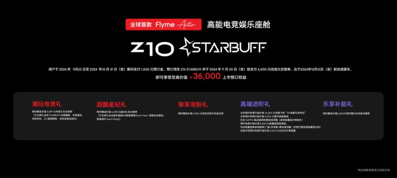 作为星纪魅族与领克联合打造的首款电竞定制版车型,Z10 STARBUFF 针对电竞兴趣人群进行深度定制,并在领克 Z10 基础车型上叠加全球首款 Flyme Auto 高能电竞娱乐座舱,实现 3A 单机游戏和 PC 端游双重自由。