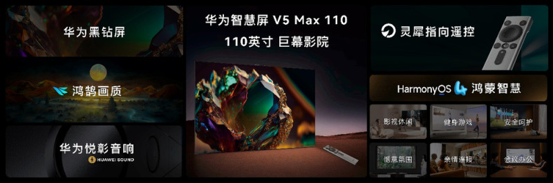 华为史上尺寸最大、画质最强的华为智慧屏 V5 Max 110正式亮相。新品采用110英寸超大屏幕,屏占比达到99%,边框仅有1.2mm,屏幕面积比98英寸足足大了 26.4%,配备超凡的Super MiniLED屏幕——华为黑钻屏,该屏幕采用黑钻聚能SuperMiniLED、多晶量子点膜、黑钻超维场液晶技术、黑钻全景臻彩液晶补偿、纳米复合低反膜等技术手段,使得显示屏拥有了高亮度、高色域、高对比、广视角、超低反射五大核心优势。此外华为智慧屏 V5 Max 110精确控光分区,峰值亮度达到5000nits,在强光环境中屏幕上的内容依然清晰可见。DCI-P3 125%、BT2020 91%的超广色域,加上日本前索尼专家调优、自动PQ调试调色,带来电影级的显色能力。