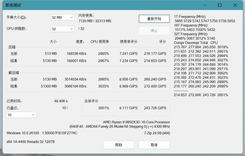 整个ZEN5架构将每个和新的整数单元增加50%,配套的调度器也增加50%,同时将L1和L2的带宽翻倍,这使得整体的IPC性能提升16%,这其中锐龙9 9950X3D采用16核心32线程设计,频率标定为4.3-5.7GHz,拥有64MB三级缓存,以及16MB二级缓存,128MB的三级缓存,Cache部分来到了144MB,热设计功耗170W。