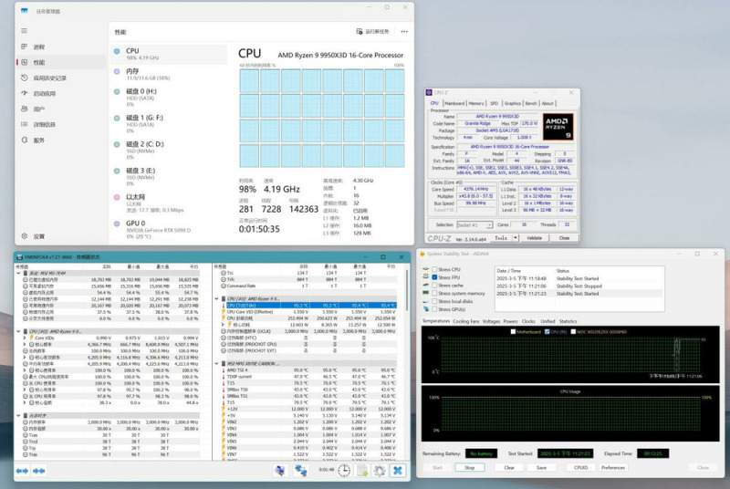 单烤FPU下,散热为九州风神冰魔方360水冷,CPU封装功耗为253W,温度为95摄氏度,频率为4.19GHz。