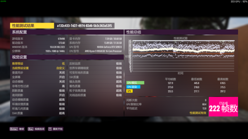 锐龙9 9950X3D在1080P极端画质关闭DLSS下取得222fps,