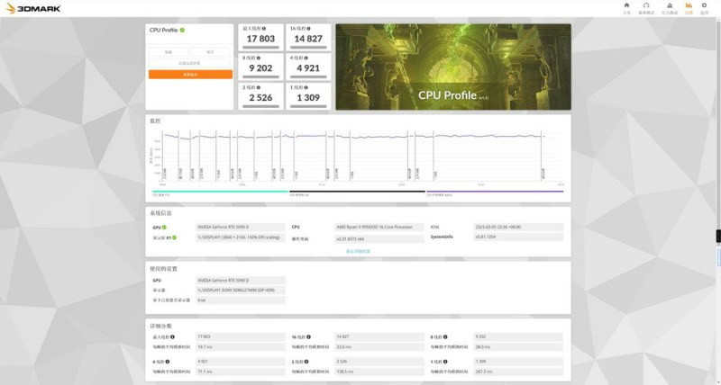 锐龙9 9950X3D的CPU Profile项目中,单核1309分,多核17803分。