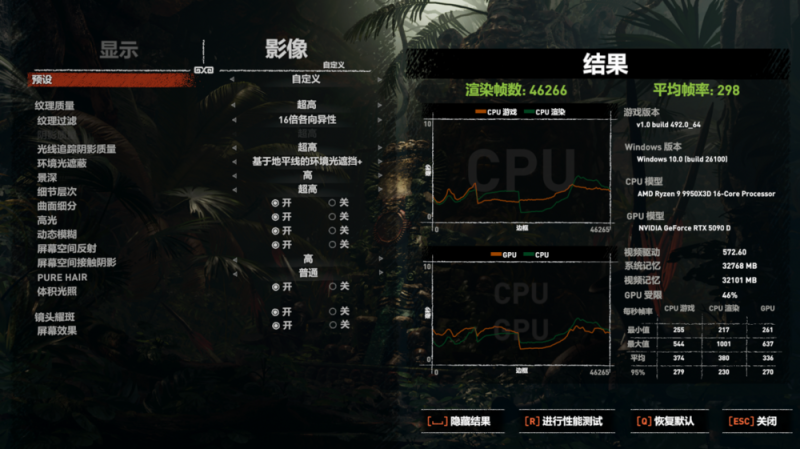 锐龙9 9950X3D在1080P超高画质,关闭光追下取得298fps,