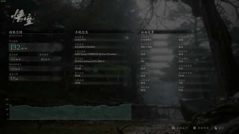 锐龙9 9950X3D在1080P画质超高关闭光追和DLSS,下取得132fps、最低帧为86fps。