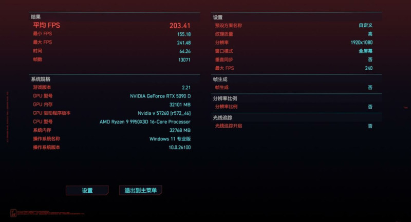 锐龙9 9950X3D在1080P下取得全高画质关闭光追和DLSS的赛博2077,帧率为203.41的平均帧率、最低帧为155.18。