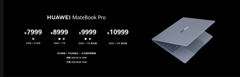 鸿蒙笔记本电脑HUAWEI MateBook Pro则搭配了晴蓝、砚黑、宣白三款优雅配色,并提供标准版与柔光版可选。售价方面,HUAWEI MateBook Pro 7999元起,其中,24GB+512GB标准版售价7999元、32GB+1TB标准版售价8999元, 32GB+1TB柔光版售价9999元, 32GB+2TB柔光版售价10999元。5月19日18:08开启预售,6月6日10:08在华为商城,华为体验店/华为授权零售商开售。