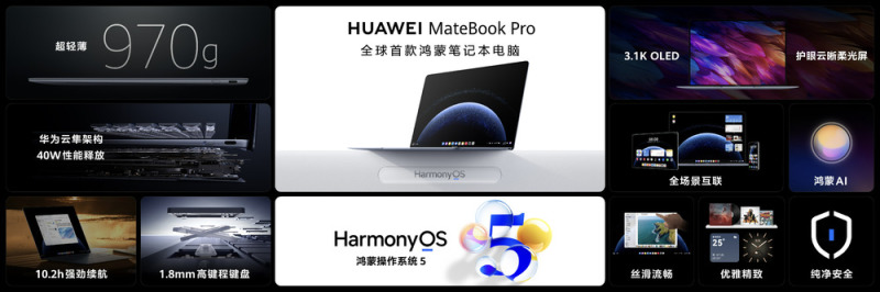 除了HUAWEI MateBook Fold 非凡大师,全新HUAWEI MateBook Pro也是此次发布会的一大亮点,同样搭载HarmonyOS 5,兼顾轻薄与强劲性能,为用户带来焕然一新的笔记本体验。其采用全新一代华为云隼架构,整机重量仅970g ,厚度仅13.5毫米的同时,散热、续航表现强劲,为轻薄本市场设定性能新标杆;显示重磅升级,打造业界首款搭载OLED护眼云晰柔光屏的笔记本电脑,为用户带来流畅清晰、色彩准确、明暗真实、舒适护眼的视觉体验;融合多重创新科技,包括小艺智慧键一键AI模式,为用户带来畅快的使用体验。