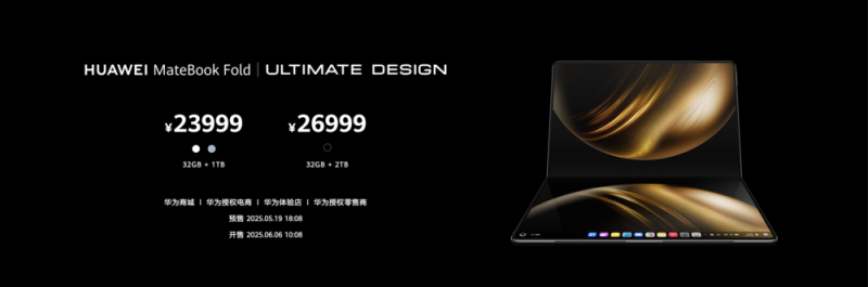售价方面,HUAWEI MateBook Fold 非凡大师新品提供2个配置可选,其中32GB+1TB版本售价23999元、32GB+2TB版本售价26999元。5月19日18:08开启预售,6月6日10:08在华为商城/华为授权电商,华为体验店/华为授权零售商平台全面开售。
