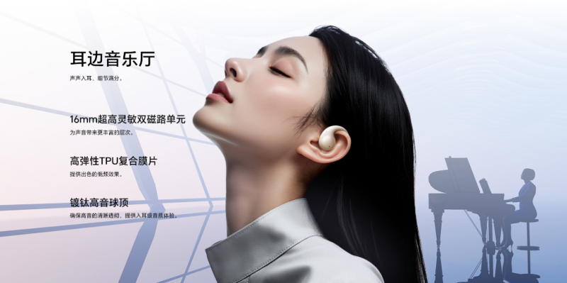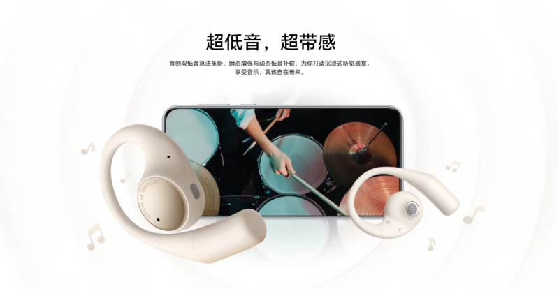 针对开放式结构的音质局限,荣耀Earbuds开放式首创双低音算法革新,融合动态低音补偿+瞬态增强,让用户无论身处何地,都能如身处音乐会现场一般,清晰感受音符的跳动。此外,荣耀Earbuds开放式耳机还配备了自研空间音频算法,通过自然混响渲染和高精度定位算法,能打造出360°影院级环绕声场,为用户带来全景沉浸的澎湃听感。