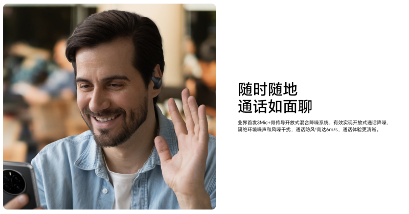 荣耀Earbuds开放式耳机可以实现主动降噪功能,搭载业界首发的3Mic+骨传导开放式混合降噪系统,能有效实现开放式通话降噪隔绝环境噪声和风噪干扰,通话防风高达6m/s,在通勤地铁、户外街道、嘈杂咖啡馆等环境中精准分离人声与环境噪音,实现“通话如面聊”的清晰沟通体验。