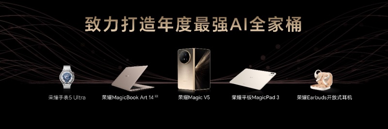 此外,本次发布会荣耀还带来AI终端生态家族的全家桶旗舰新品。全球最薄、地表最强折叠屏荣耀Magic V5,以突破性的制造工艺和技术创新、全面满血的旗舰性能配置,以及AI智能体的多功能应用、多生态覆盖,再次定义折叠旗舰新标准。荣耀MagicBook Art 14 2025上线一语智控功能,实现“搜阅创控”全链路多任务一句话操作,开启AI PC自动驾驶时代;荣耀平板MagicPad3 13.3英寸大屏旗舰平板,首发全局 AI 生产力,业内首次实现与 iOS、鸿蒙、安卓系统手机无缝互传,打造大屏旗舰最强AI平板;荣耀Earbuds开放式耳机支持AI翻译,随时调用YOYO,是用户贴身的AI私人助理。