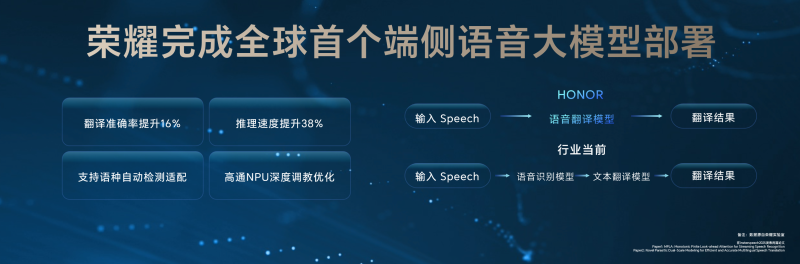 值得一提的是,荣耀突破端侧实时语音转写和翻译的关键技术挑战,完成了全球首个端侧语音大模型的部署,支持实时语音翻译和离线使用,翻译准确率提升16%,推理速度提升38%。这得益于荣耀两项AI语音技术突破,并且相关论文成果已被国际语音顶尖会议InterSpeech录用。