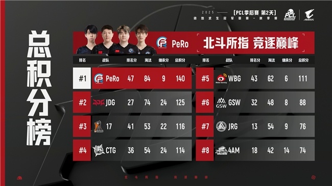 第二天比赛过后,PeRo战队继续领先,JDG和17战队紧随其后。