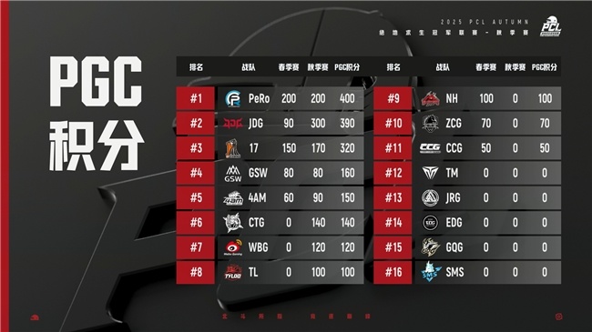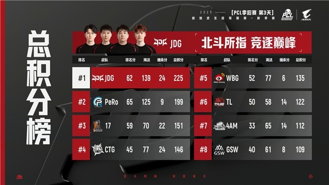 至此,2025PUBG PCL秋季赛圆满结束,而JDG战队、PeRo战队、17战队、CTG战队和4AM战队将共同组成PCL的王者之师,出征后续的PGS9、PGS10世界系列赛。
