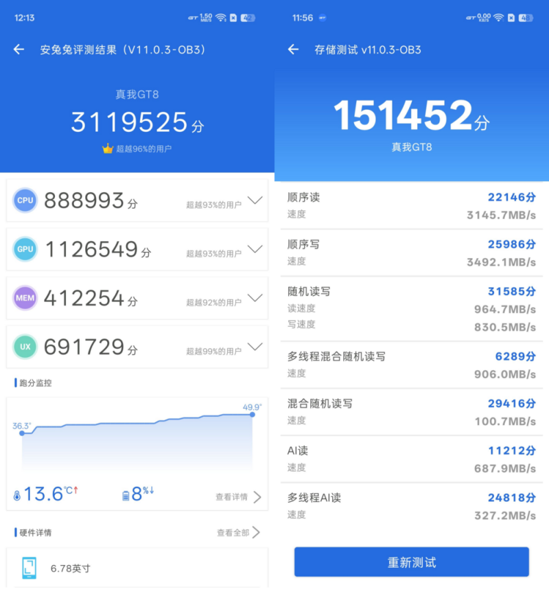 性能方面真我GT8搭载高通骁龙8 Elite旗舰芯片,采用台积电3nm先进制程工艺,CPU架构为2颗4.32GHz超大核+6颗性能核心的全大核配置,能效比相较前代提升35%。
