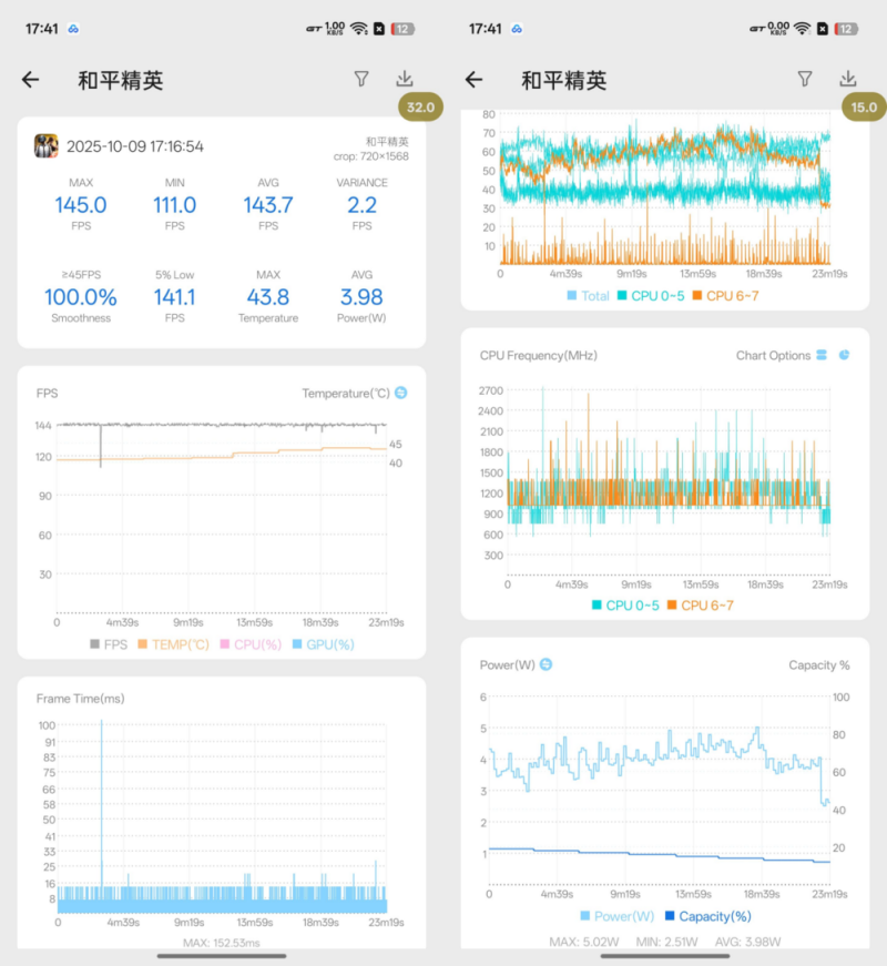 和平精英最大帧率145fps、平均帧率143.7fps、5%low帧为141.1fps属于非常流畅梯队,
