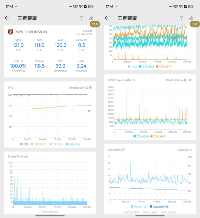 实际游戏帧率上,王者荣耀半小时游戏最大帧数121fps、平均120.2fps、5%low帧118.5fps,属于非常流畅梯队