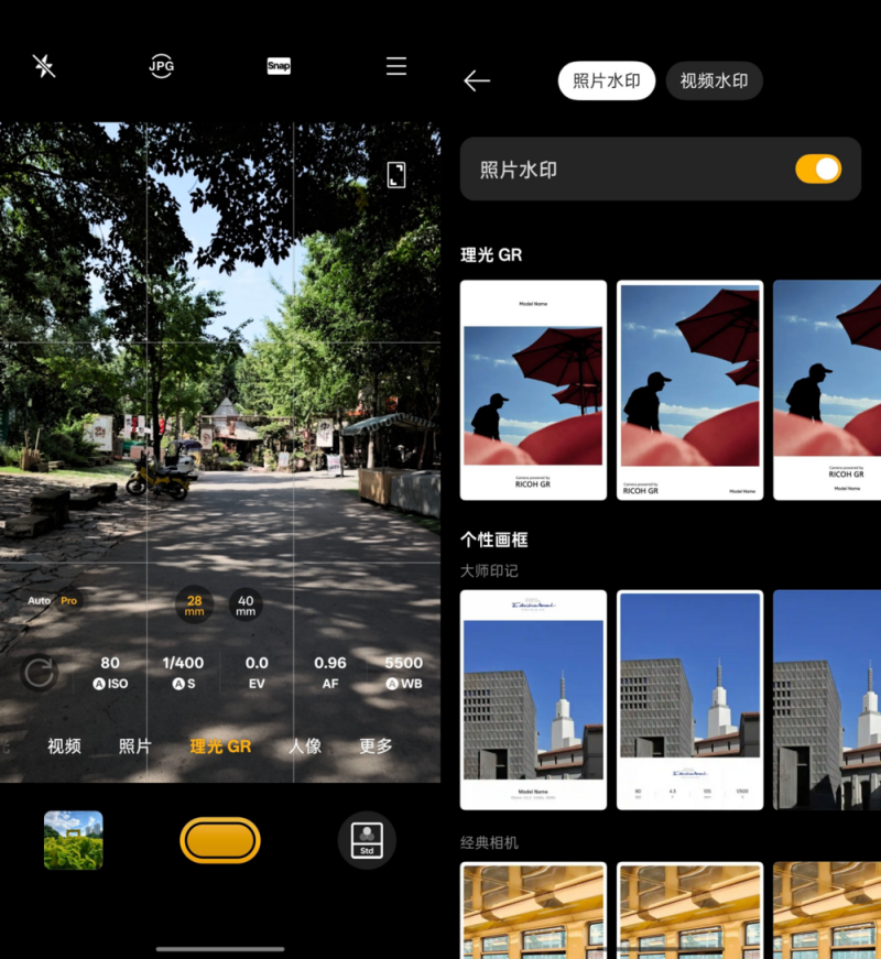 除了常规的相机界面外,真我GT8在相机界面里面内置了理光GR模式,有28mm和40mm可选,同时内置Auto和Pro模式,Auto顾名思义就是自动模式,Pro其实就是大家熟知的手动模式,这里里面像是ISO、快门、EV、AF、白平衡都可以手动调节,此外内置理光GR五大经典胶片影调,同时在水印界面也内置了理光专属的水印,不过当切换到理光水印后常规的相机水印就不可用,而且仅仅适合在理光GR模式下使用水印。