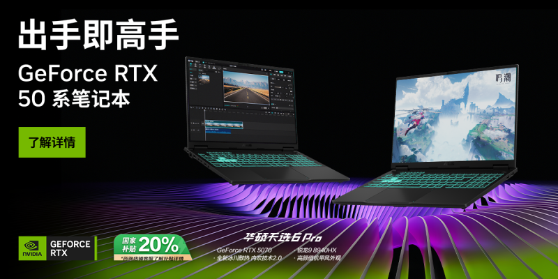 GeForce RTX 50系笔记本天选6 Pro锐龙版双11限时超值优惠!搭载 NVIDIA Blackwell 架构,由 NVIDIA AI 加速 和 DLSS 4带来全新多帧生成技术,实现工作、学习和娱乐的全方位 AI 性能新体验,新玩法!轻松助力用户学习速度提升 20 倍:加速 AI 开发流程;创作速度提升 10 倍:使用 AI 赋能的图像生成技术;游戏速度提升 12 倍:畅玩当今现代游戏。