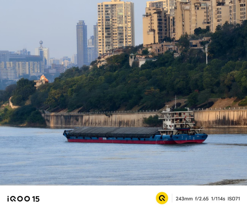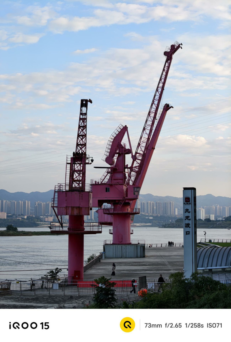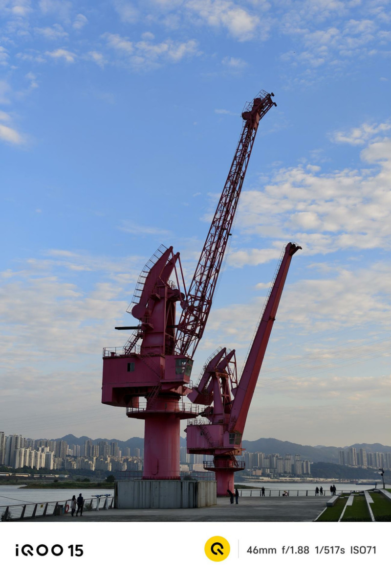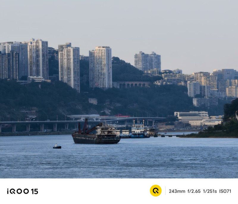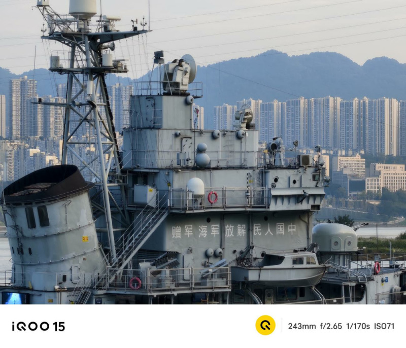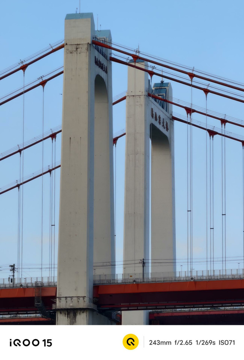 iQOO 15拍摄远处货船、建筑、飞机时,即使在243mm高倍变焦下,细节依然清晰可辨,如军舰上的中国人民解放军海军赠字样、建筑的纹理都能精准还原;搭配OIS光学防抖,高倍变焦时画面稳定性出色,没有明显的模糊或噪点爆炸,这在演唱会、远景风光等场景中实用性极强。主摄和中焦段拍摄的建筑、桥梁样张,色彩鲜艳且层次分明,画面锐利度高,建筑线条和细节刻画清晰;
