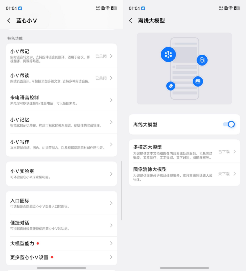 智能化功能丰富,蓝心小V助手支持自然语言搜索手机中的照片、文件、短信等信息,还能结合GPT能力生成文本、图片,