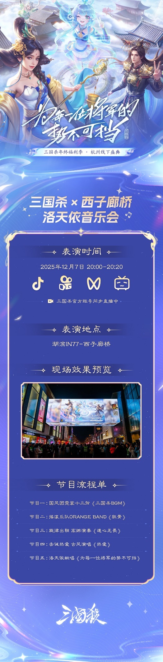 12月限定线下盛宴来袭,邀你共赴三国之约!12月6日,西湖长廊将上演一场时长20分钟的专属音乐会,洛天依相关主题演出精彩呈现,湖光山色搭配动人旋律,沉浸式感受三国与音乐的碰撞;12月5日-12月7日,在杭州in77步行街超大规模《三国杀移动版》线下打卡点同步开放,趣味互动打卡活动密集上线,打卡就能解锁专属惊喜,邀上好友一起玩转三国狂欢场!