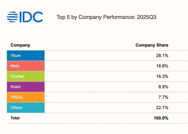 近日,国际数据机构 IDC 公布 2025 年 Q3 美国 AR 市场销量排名。全球 XR 领域的“隐形巨头” VITURE 以近三分之一市场份额夺得冠军,也就是说,在美国每售出 3 台 AR 眼镜,就有 1 台来自 VITURE。国际巨头 Meta 位列第二,雷鸟创新与 Rokid 分列第三、第四,XREAL 排名第五。