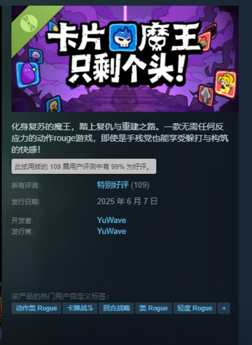 轻松治愈的卡通画风、策略与动作并存的创新玩法、脑洞大开的 Boss 设计、海量搭配的肉鸽元素,让《卡片魔王:只剩个头》成为一款极具特色的独立游戏。游戏将在26年Q2上线,目前Demo 已在Steam上线,感兴趣的玩家可以直接前往体验,也可以先将游戏加入愿望单,等待正式版的完整冒险。