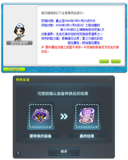 同时,维护前已创建的剑斗/阴阳师,且完成6转的角色,可接取发放[晓之阵]HEXA矩阵重置卷轴任务,获得HEXA矩阵重置卷轴,使用后可初始化HEXA矩阵的技能核心、专精核心、强化核心,提取符合强化等级的索尔艾尔达及索尔艾尔达碎片。