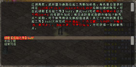 在新服【马啸苍穹】,凡最后登录时间在2026年4月8日00:00前的老角色,或活动开启后新建且等级达到120级的大侠,均可前往江湖接引使处激活后起之秀专属BUFF,享受150级技能经验提升50%、一条龙侠义赏双倍的极速成长;携带BUFF领取日常活跃度奖励还可获得新秀令,在活动商店兑换珍稀好物;队伍中携有该BUFF的侠士一同挑战时间的挑战、炎帝宝藏、五行阵、侠峰论剑、官府通缉、剑冢迷宫、玉皇顶等经典玩法,队友还能额外获得侠义令,新老携手共闯江湖,成长与福利双丰收!